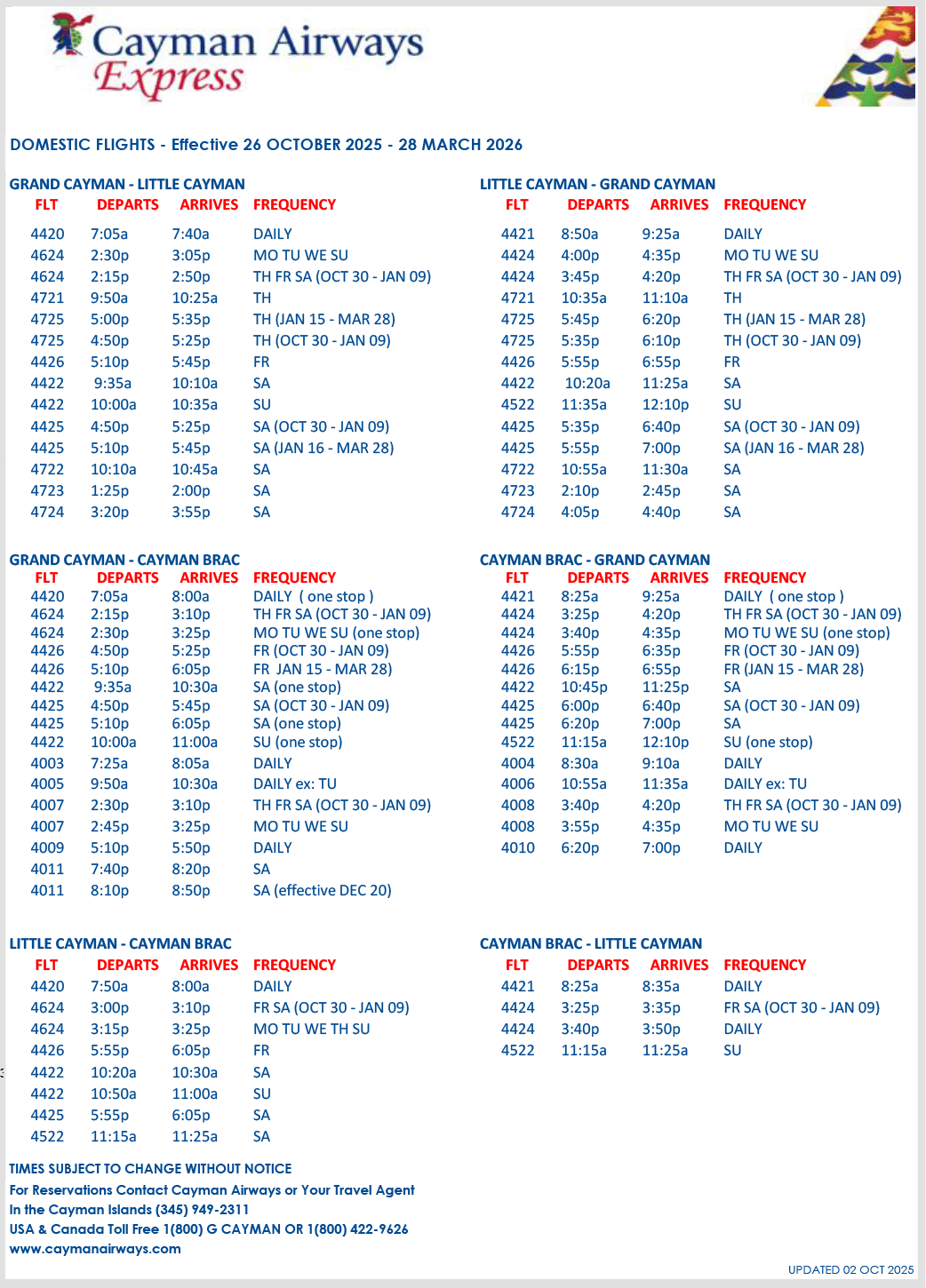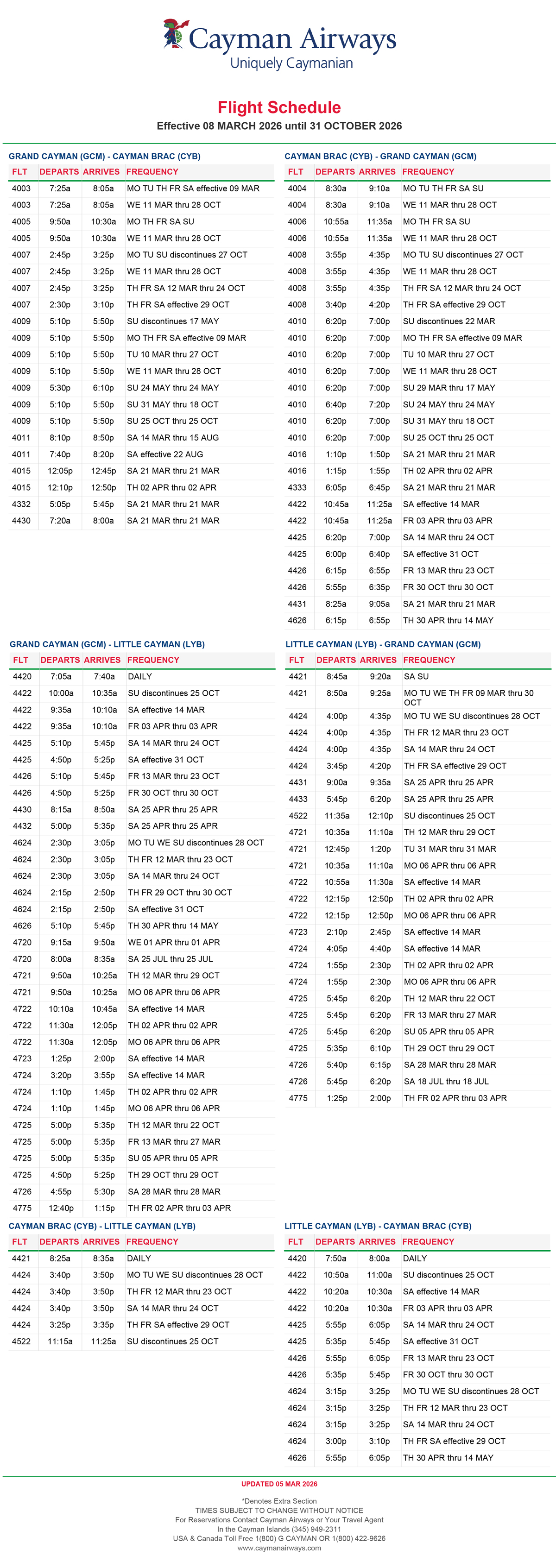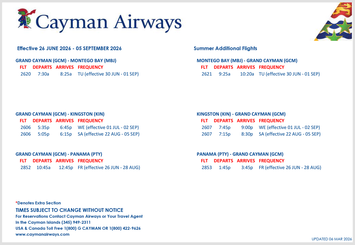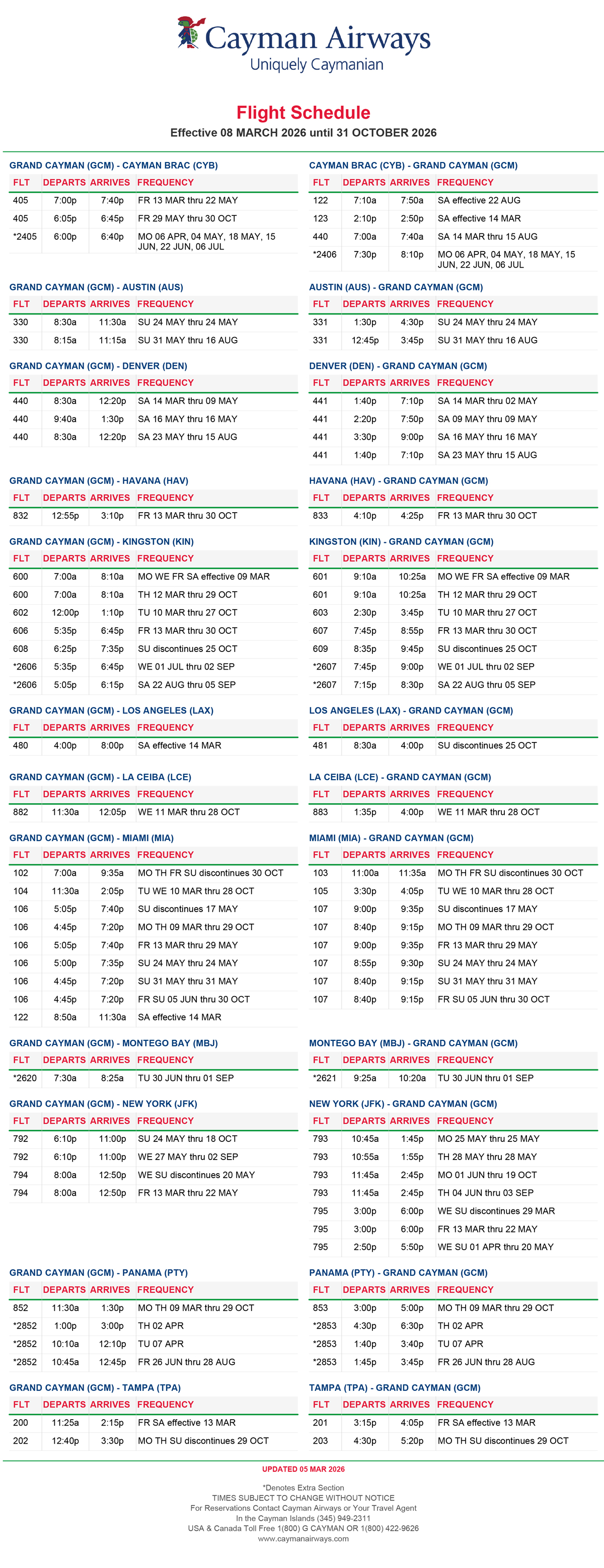 PLEASE NOTE: This schedule is subject to changes that may not be reflected right away on this page. So if you're planning a trip, please check flight availability using the booking window on our website, or call Cayman Airways Reservations on: 345-949-2311; 1-800-422-9626 (toll free in the USA); 866-759-1372 (toll free in Jamaica); or 800-2791-9422 (toll free in Honduras).